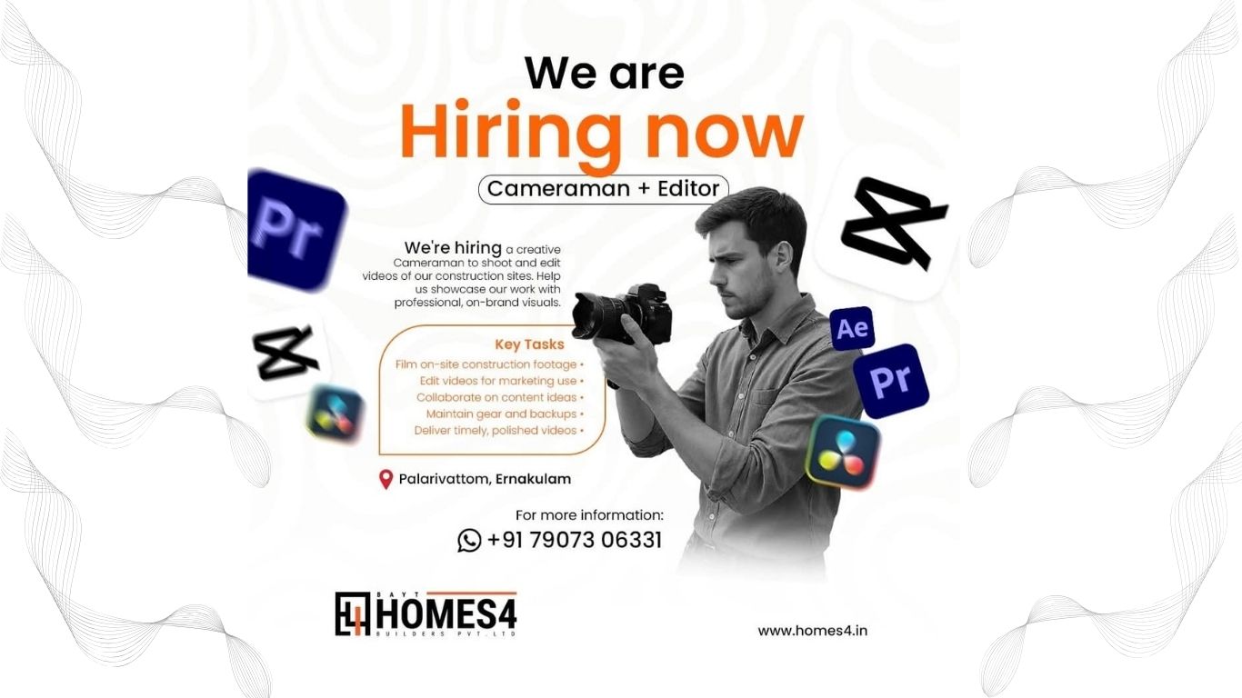 Creative Hut Placement Cell continues to provide hands-on career opportunities for its students by connecting them with industry-relevant roles. Homes4 offers the current job vacancy for the position of Cameraman + Editor, ideal for students skilled in both capturing high-quality visuals and crafting compelling edits. This role offers real-world experience in producing professional video content for commercial and promotional use. Through such placements, Creative Hut ensures its students are well-prepared to succeed in dynamic media and content creation environments.